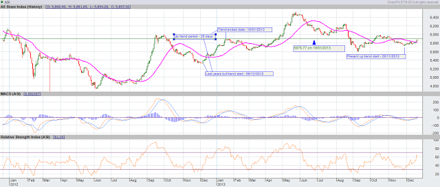 The present up trend was  initiated on the 28th of November 2013, in that period of 16 days we saw 4 bear candles and 12 bull candles, whilst the last been a bear candle. The index had increased from an open of 5744.29 on the 28th of Nov to a close of 5857.36 on the 20th of Dec. An increase of  113.07 points or 1.97%. As many would suggest the  period towards the latter part of an year the market tends to backtrack, but interestingly both this year and the last it has not been so. On the 6th of Dec 2012 the market had gone into a bull trend, which lasted for a period of 29 days till the 18thof Jan 2013. The index that was 5783.33 on the 6th of Dec '12 had gone upto 5875.77 by the 18th of Jan'13. That is an increase of 92.44 points(+1.6%). The present situation is interesting for 2 reasons. 1. Market has already gone up 113.07 points(+1.97), in 16 days. 2. We are just around the peak of the said up trend.